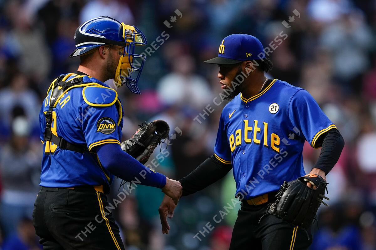 Seattle Mariners catcher Mitch Garver greets relief pitcher Eduard Bazardo as they celebrate a 7-0 win over the Texas Rangers in a baseball game Sunday, Sept. 15, 2024, in Seattle. (AP Photo/Lindsey Wasson)