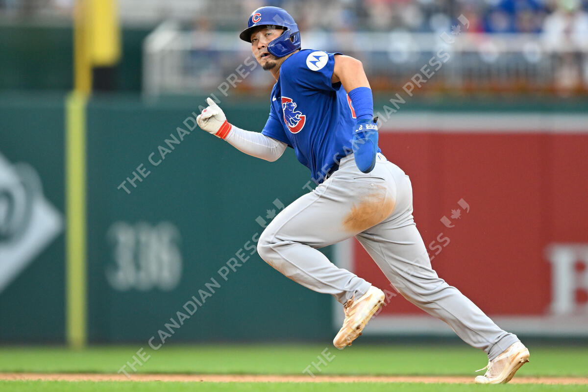Chicago Cubs' Seiya Suzuki takes off from second base and heads for home where he was thrown out during the eighth inning of a baseball game against the Washington Nationals, Saturday, Aug. 31, 2024, in Washington. (AP Photo/John McDonnell)