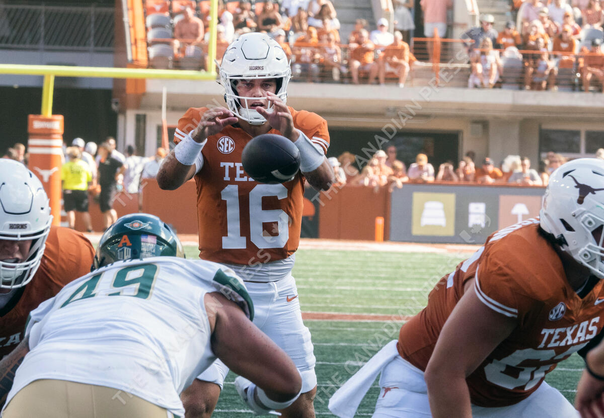 Texas quarterback Arch Manning (16) takes the snap during the second half of an NCAA football game against Colorado State, Saturday, August 31, 2024, in Austin, Texas. Texas won 52-0. (AP Photo/Michael Thomas)