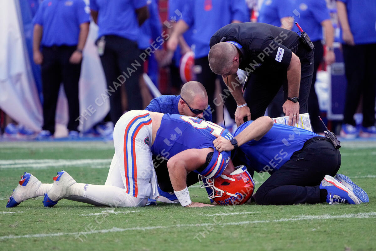 Florida quarterback Graham Mertz, front left, is looked at by head coach Billy Napier, top right, and other team personnel after he was injured during the second half of an NCAA college football game against Miami, Saturday, Aug. 31, 2024, in Gainesville, Fla. (AP Photo/John Raoux)