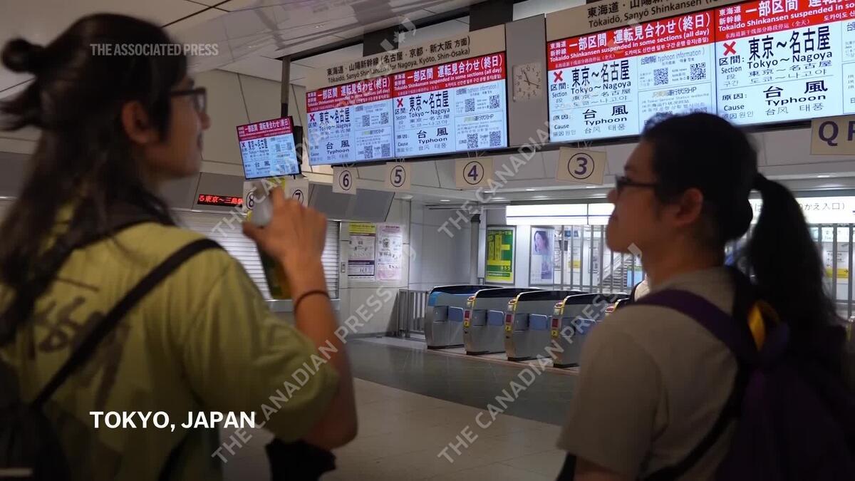 Dozens of travelers were stranded in Tokyo station after Shinkansen bullet trains were suspended between Japan’s capital and Osaka on Friday, while hundreds of domestic flights were also canceled, as a slow-moving tropical storm caused travel disruption in the county.