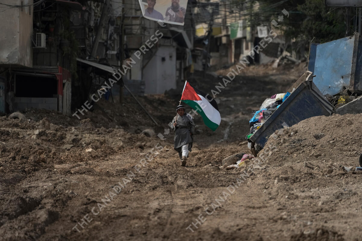 Palestinian activist Khairi Hanoon walks with the Palestinian flag on a damaged road following an Israeli army raid in Tulkarem, West Bank, on Tuesday, Sept. 3, 2024. (AP Photo/Majdi Mohammed)