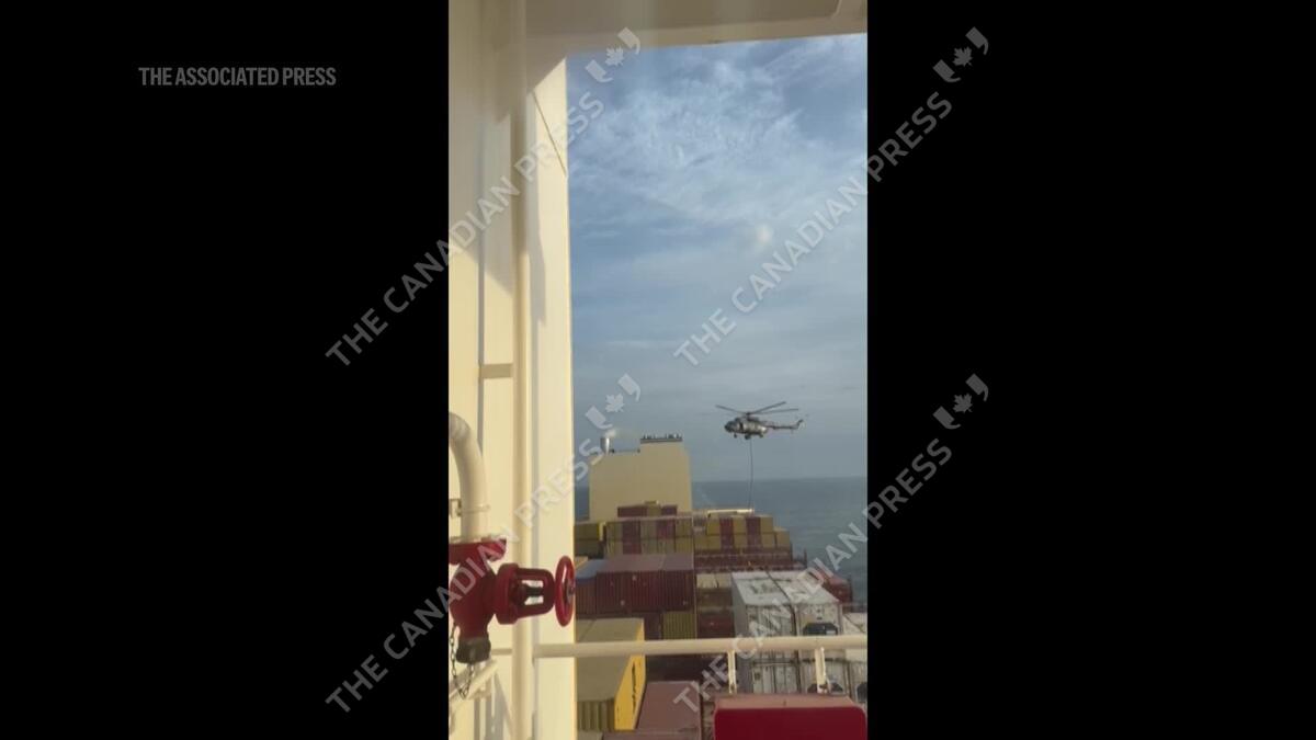A video seen by AP appears to show an attack on a vessel near the Strait of Hormuz that a Mideast defense official alleges Iran carried out on Saturday. The video appears to show a helicopter flying over the vessels as commandos fast-roped down to the ship.
