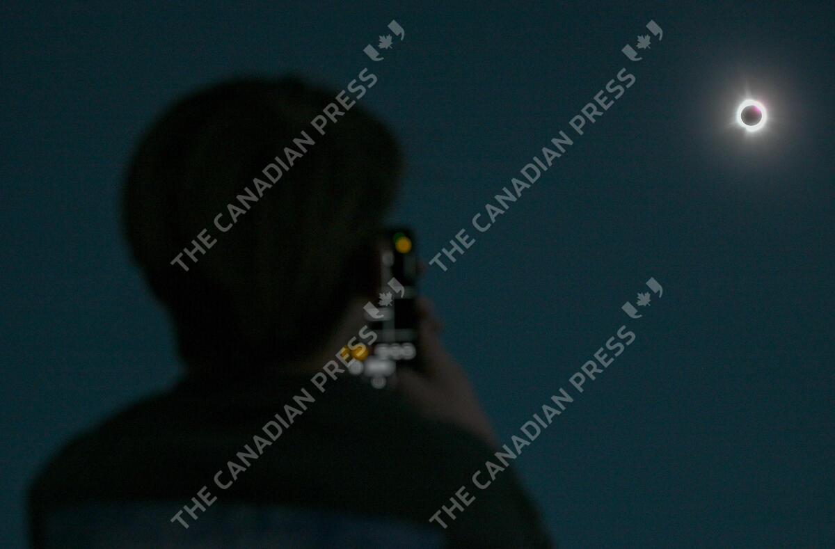 A person takes a photograph of the sun during totality as the moon passes between it and the earth resulting in a total solar eclipse in Montreal, Monday, April 8, 2024. THE CANADIAN PRESS/Graham Hughes