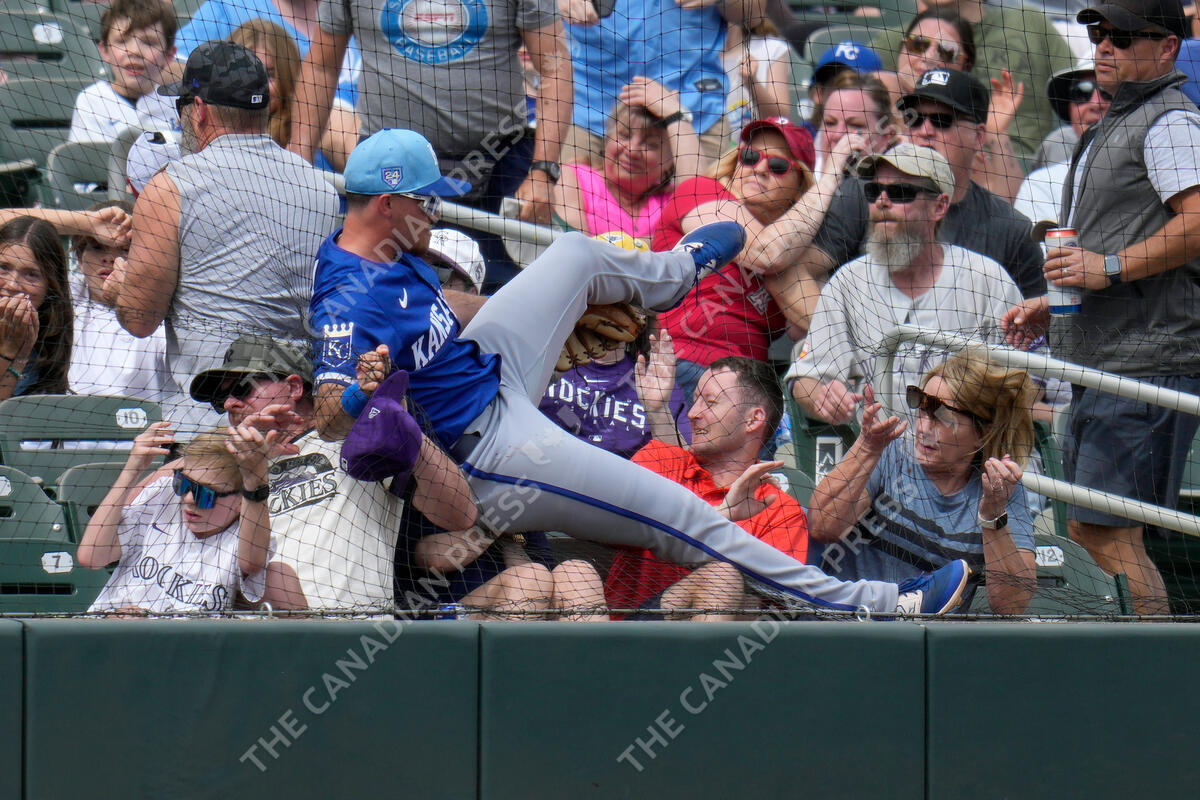 Kansas City Royals third baseman Nick Loftin crashes into the netting and the first row of fans as he failed to make a play on a foul ball hit by Colorado Rockies' Nolan Jones during the second inning of a spring training baseball game Tuesday, March 12, 2024, in Scottsdale, Ariz. (AP Photo/Ross D. Franklin)