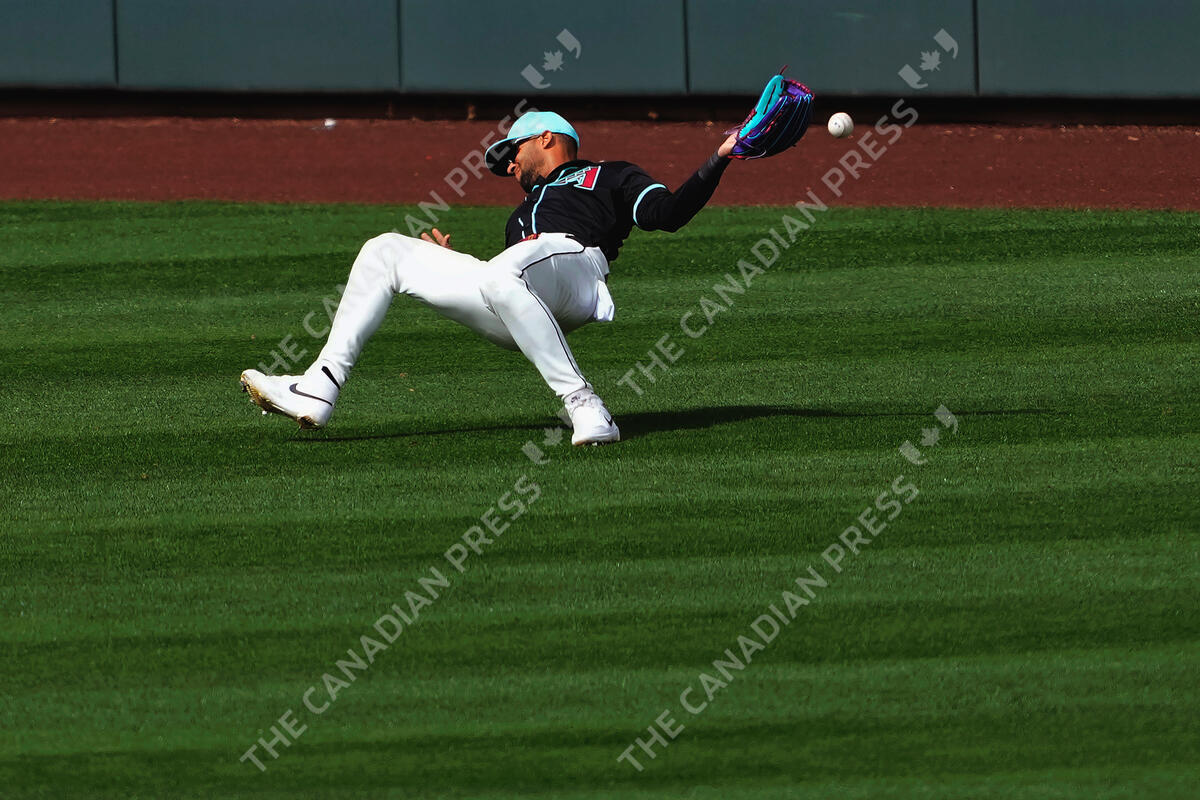 Arizona Diamondbacks' Lourdes Gurriel Jr. loses a ball in the sunlight hit by Kansas City Royals' Adam Frazier for an error during the fourth inning of a spring training baseball game, Thursday, March 14, 2024, in Scottsdale, Ariz. (AP Photo/Matt York)