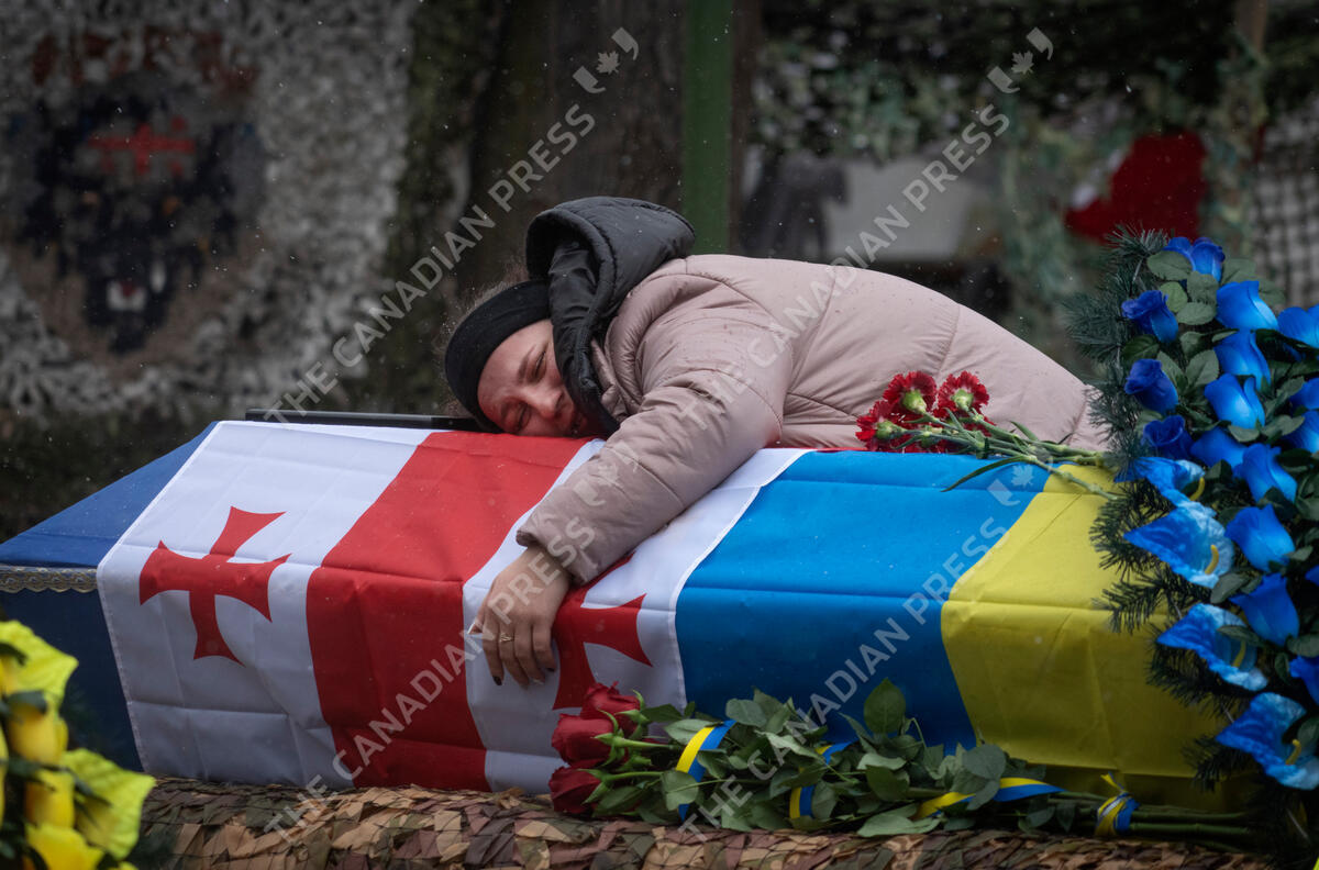 A relative mourns over a coffin of Nodar Nasirov, 28, a volunteer of the Georgian legion who was killed in a battle against Russian troops, during a funeral ceremony in Kyiv, Ukraine, Tuesday, March 12, 2024. The Georgian legion is a military unit formed mainly by ethnic Georgian volunteers. (AP Photo/Efrem Lukatsky)