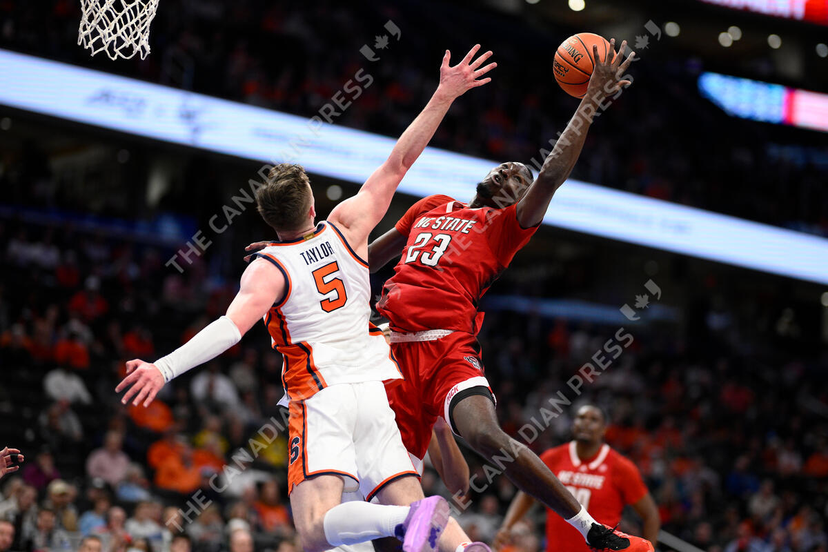 North Carolina State forward Mohamed Diarra (23) runs into Syracuse guard Justin Taylor (5) during the first half of the Atlantic Coast Conference NCAA college basketball tournament Wednesday, March 13, 2024, in Washington. (AP Photo/Nick Wass)