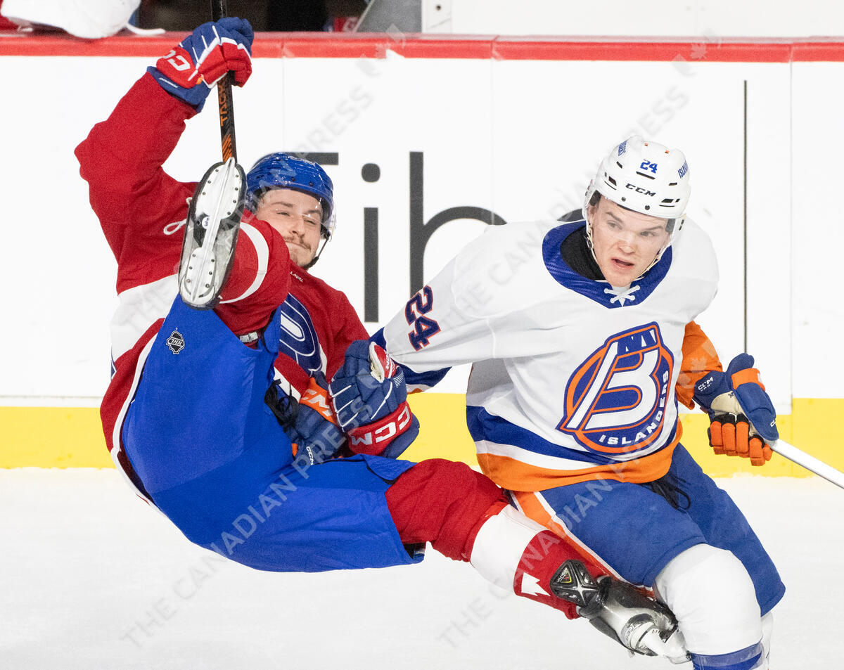 Laval Rocket's Jacob Perreault (34) is tripped up by Bridgeport Islanders' Karson Kuhlman (24) during third period AHL hockey action in Laval, Que. on Wednesday, March 13, 2024. THE CANADIAN PRESS/Christinne Muschi