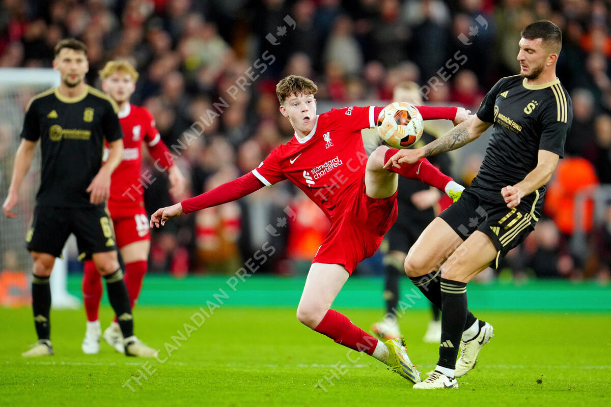 Liverpool's James McConnell vies for the ball with Sparta's Indrit Tuci, right, during the Europa League round of 16, second leg, soccer match between Liverpool and Sparta Praha at Anfield Stadium, Liverpool, England, Thursday March 14, 2024. (AP Photo/Jon Super)