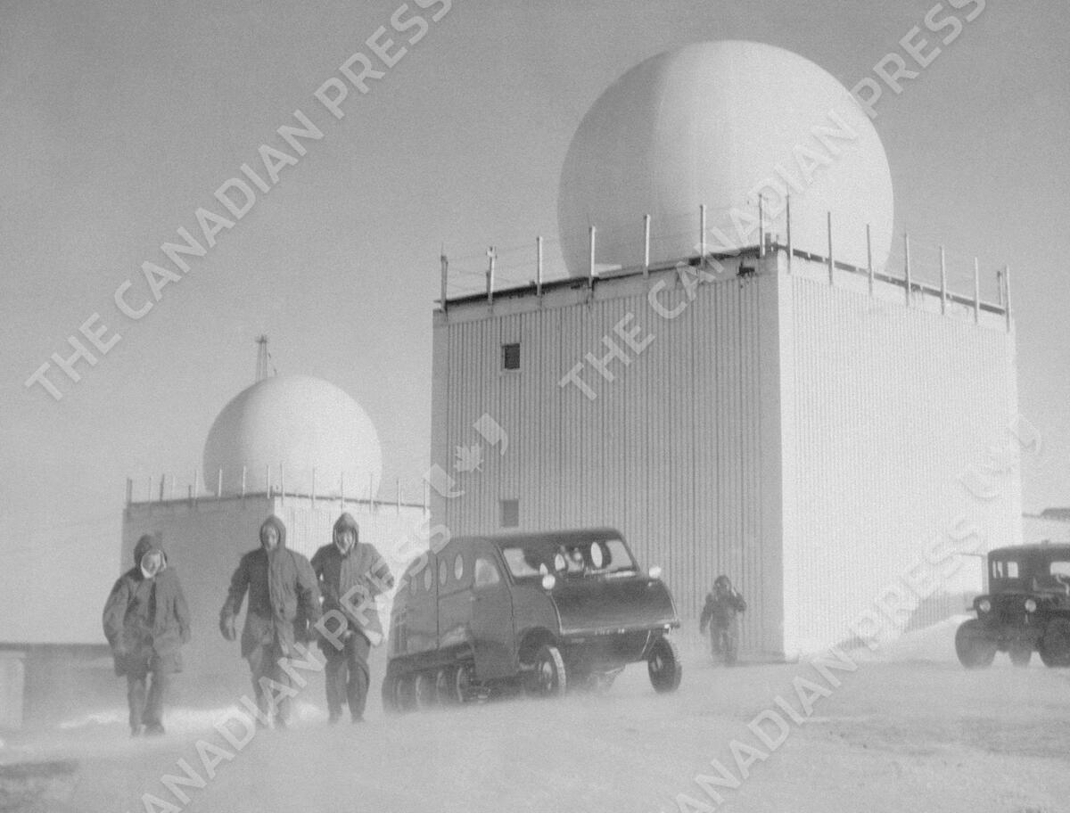 Like gaint snowballs, radar domes rise high above the roofs of buildings at a radar site, on Baffin Island on April 10, 1956, while below three members of the radar force struggle through the wind-blown snow. This site, above the Arctic Circle, is one of a number being built along a 3,000 mile distant early warning line from Baffin Island to Alaska. (AP Photo)