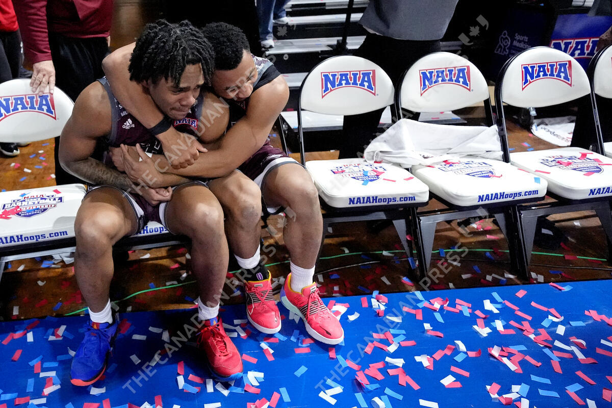 Freed-Hardeman guards Quan Lax, left, and JJ Wheat hug after their NAIA men's national championship college basketball game against Langston, Tuesday, March 26, 2024, in Kansas City, Mo. Freed-Hardeman won 71-67. (AP Photo/Charlie Riedel)