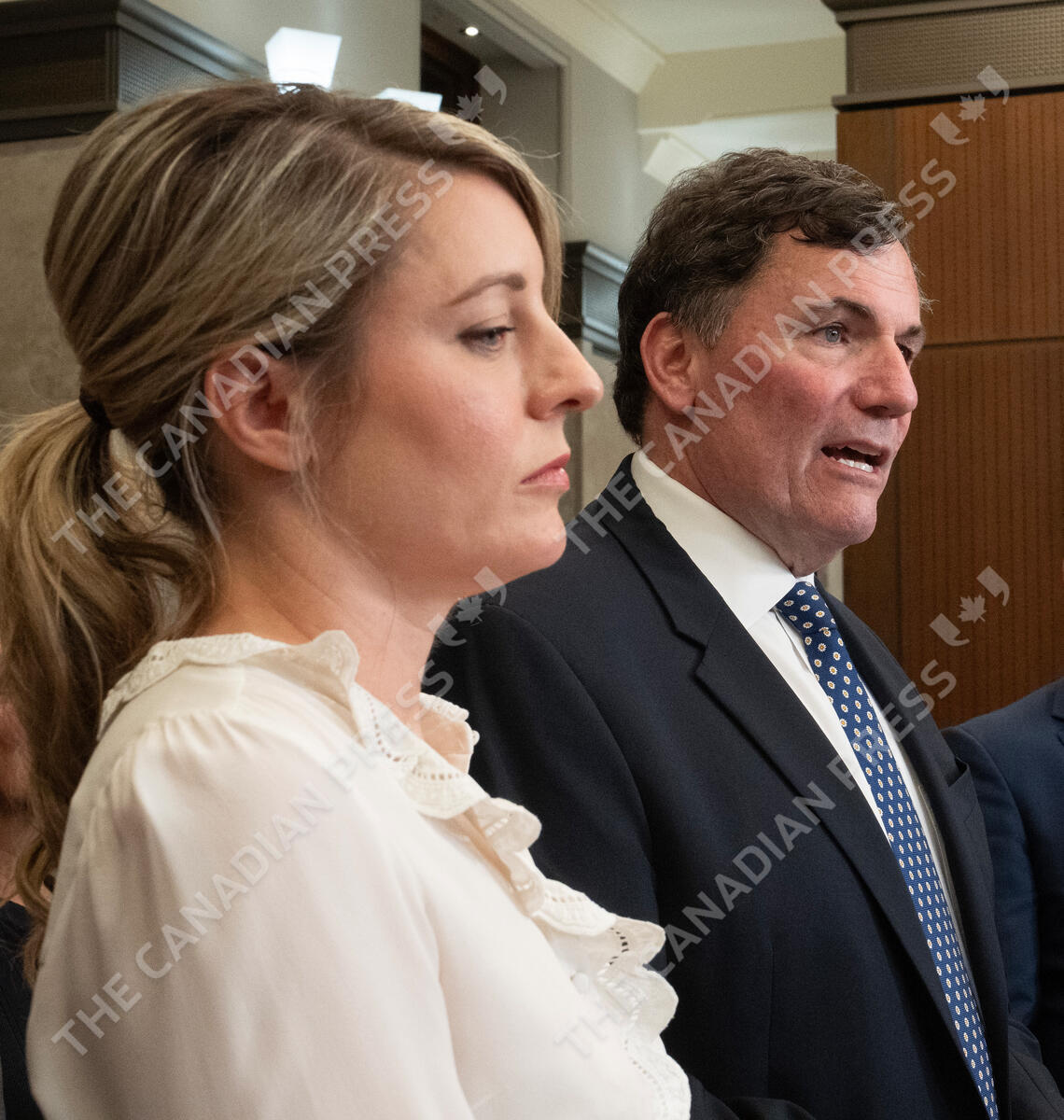 Minister of Foreign Affairs Melanie Joly looks on as Minister of Public Safety, Democratic Institutions and Intergovernmental Affairs Dominic LeBlanc makes an announcement in the Foyer of the House of Commons, in Ottawa, Wednesday, June 19, 2024. THE CANADIAN PRESS/Adrian Wyld