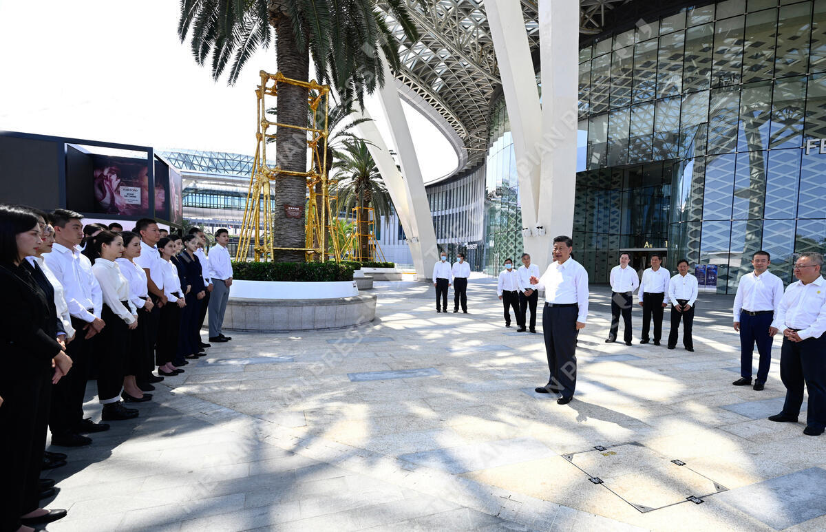 (240715) -- BEIJING, July 15, 2024 Photo by Xinhua/ABACAPRESS.COM) -- Xi Jinping communicates with staff members at an international duty-free shopping mall in Sanya, south China's Hainan Province, April 11, 2022. TO GO WITH "Profile: Xi Jinping the reformer" Photo by Xinhua/ABACAPRESS.COM/Li Xueren)