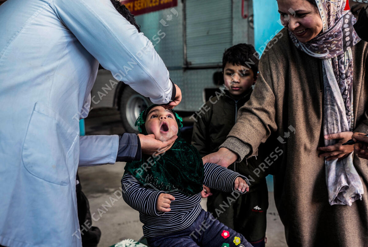 A government health worker administers polio drops to a child in Srinagar, Indian controlled Kashmir, Sunday, Mar. 3, 2024. (AP Photo/Mukhtar Khan)