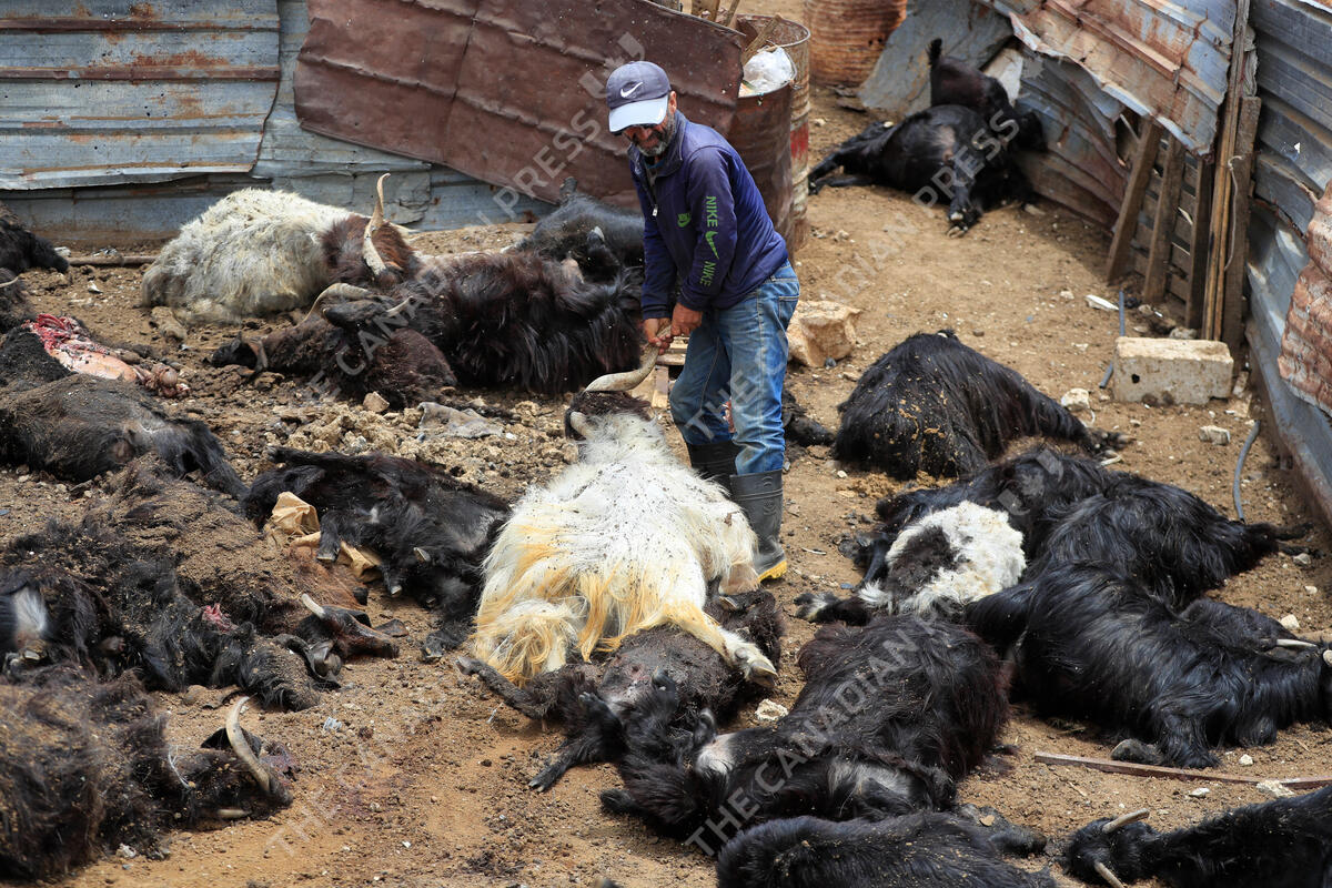 Lebanese shepherd Yussef Halimeh removes goat carcasses killed in an Israeli airstrike in the Toura mountain, south Lebanon, July 8, 2024. (AP Photo/Mohammed Zaatari)