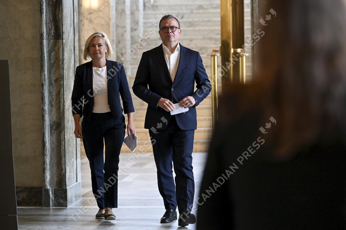 Interior Minister Mari Rantanen and Finnish Prime Minister Petteri Orpo arrive to give their comments after the vote regarding the so-called deportation law in the Finnish Parliament in Helsinki, Finland, on July 12, 2024. Finland passed law to block migrants crossing from Russia. LEHTIKUVA / MIKKO STIG - FINLAND OUT. NO THIRD PARTY SALES.