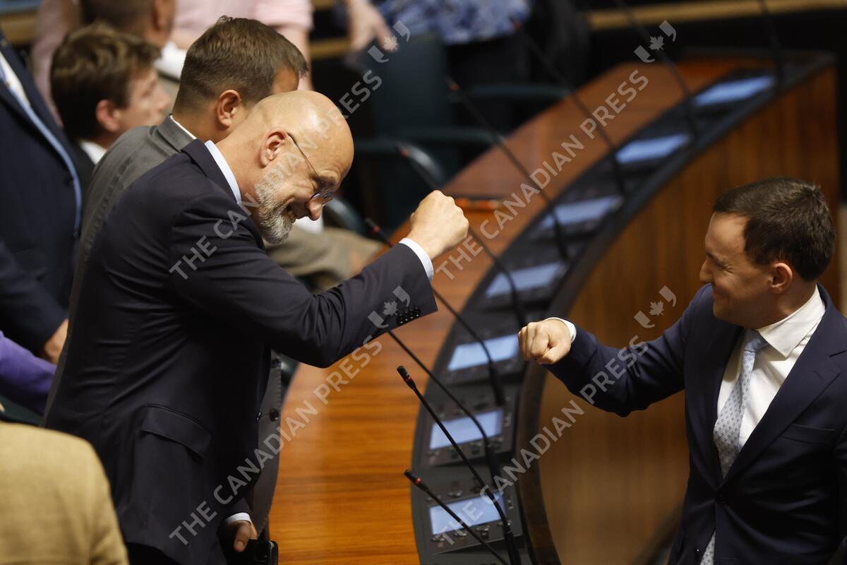 Members of Finns Party, Mauri Peltokangas and Wille Rydman, celebrate after hearing the results at the Parliament House in Helsinki, Finland, on July 12, 2024. Members of the Finnish parliament voted on the government's plans to change the country's deportation laws and passed the law. LEHTIKUVA / RONI REKOMAA - FINLAND OUT. NO THIRD PARTY SALES.
