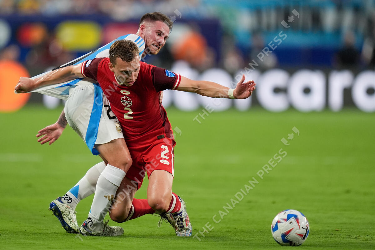 Argentina's Alexis Mac Allister, left, and Canada's Alistair Johnston battle for the ball during a Copa America semifinal soccer match in East Rutherford, N.J., Tuesday, July 9, 2024. (AP Photo/Julia Nikhinson)