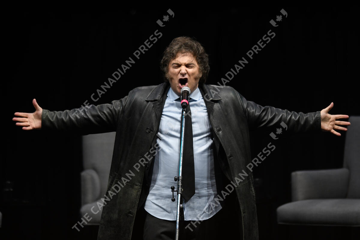 Argentine President Javier Milei sings at a promotional event for his new book in Buenos Aires, Argentina, May 22, 2024. (AP Photo/Gustavo Garello)