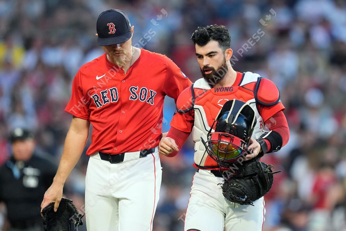 Boston Red Sox starting pitcher Tanner Houck and catcher Connor Wong walk to the dugout during the third inning of a baseball game against the Detroit Tigers, Friday, May 31, 2024, in Boston. (AP Photo/Michael Dwyer)