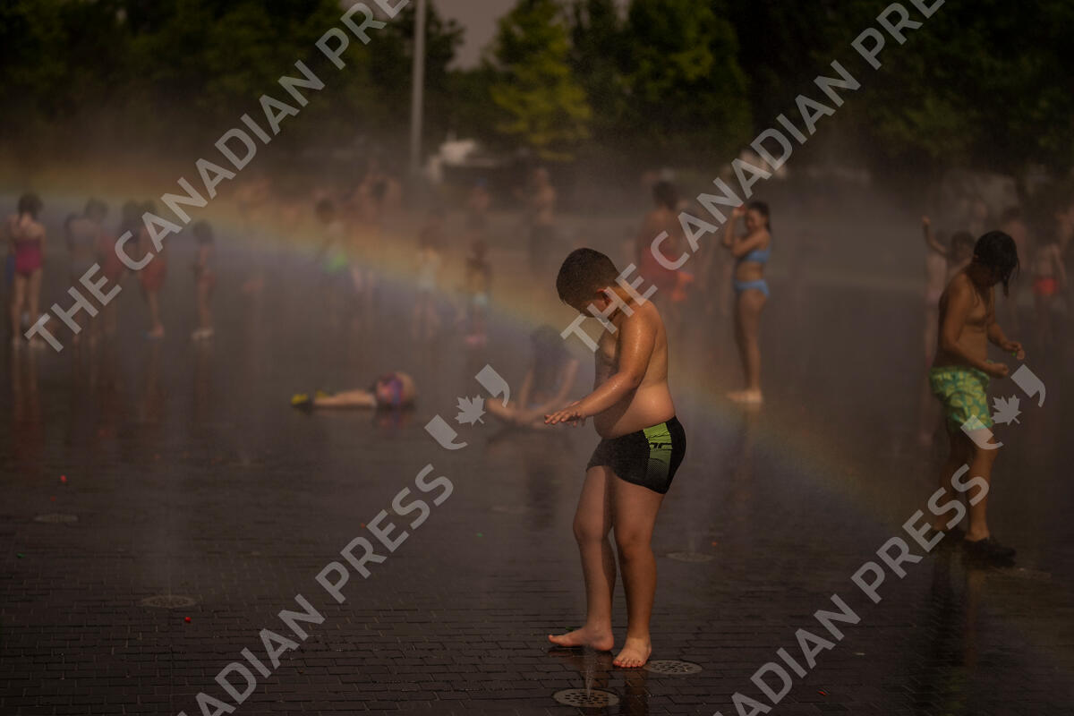 Children cool off in a fountain in a park by the river in Madrid, Spain, Wednesday, June 15, 2022. Spain's weather service says a mass of hot air from north Africa is triggering the country's first major heatwave of the year with temperatures expected to rise to 43 degrees Celsius (109 degrees Fahrenheit) in certain areas. (AP Photo/Manu Fernandez)