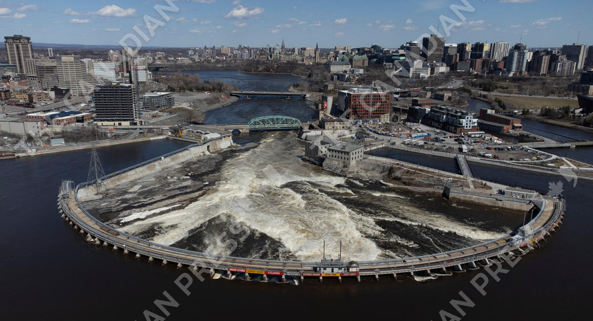 Water flows through the Chaudiere Falls located on the Ottawa river, Tuesday, April 12, 2022 in Ottawa. THE CANADIAN PRESS/Adrian Wyld