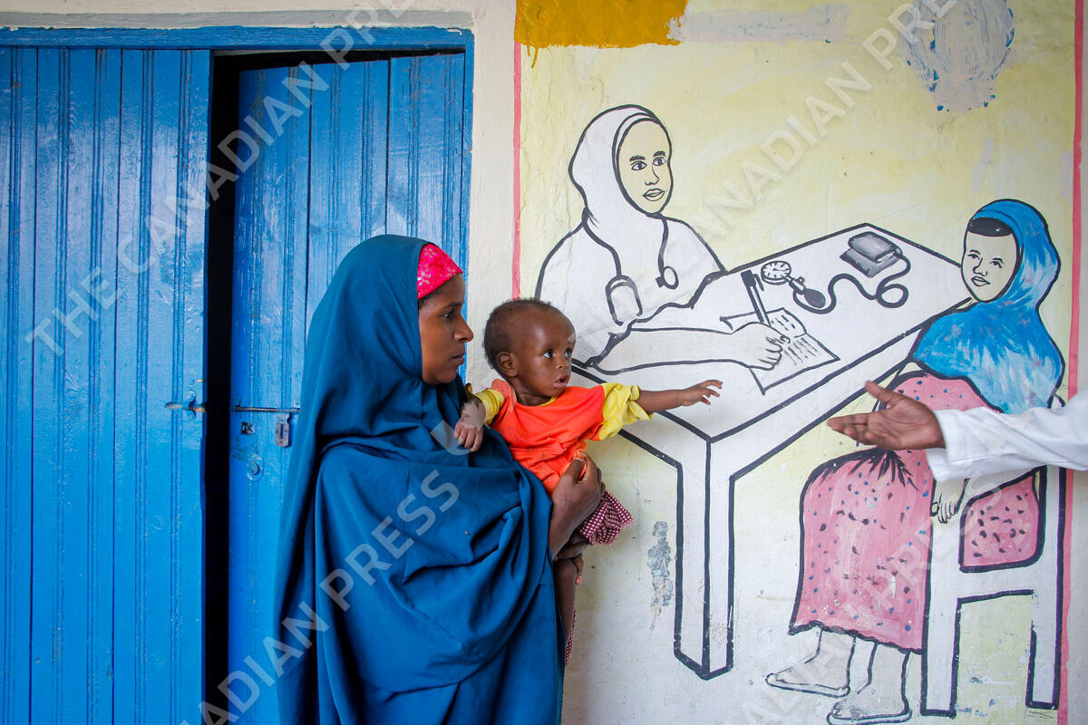 A Somali mother recently-displaced by drought holds her malnourished baby at a malnutrition stabilization center run by Action against Hunger, in Mogadishu, Somalia Sunday, June 5, 2022. Deaths have begun in the region's most parched drought in decades and previously unreported data show nearly 450 deaths this year at malnutrition treatment centers in Somalia alone. (AP Photo/Farah Abdi Warsameh)