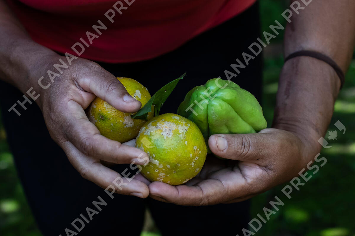 Rozineida Machado, a cook with the Vale Encantado cooperative shows fruit and vegetables grown in the Vale Encantado sustainable community in Rio de Janeiro, Brazil, Monday, June 6, 2022. Vale Encantado, the place where dozens of families live near the Tijuca National Forest has created its own sewer system to keep the local streams clean. (AP Photo/Bruna Prado)