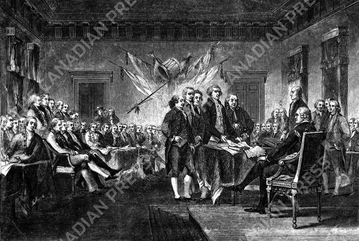 This undated engraving shows the scene on July 4, 1776 when the Declaration of Independence, drafted by Thomas Jefferson, Benjamin Franklin, John Adams, Philip Livingston and Roger Sherman, was approved by the Continental Congress in Philadelphia. The words "all men are created equal†are invoked often but are difficult to define. (AP Photo)