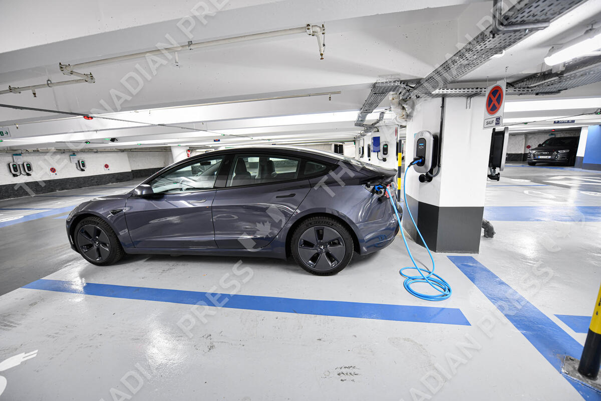 Parking under the Madeleine church, with Tesla cars plugged in to be recharged in Paris, France, on April 24, 2022. Half a thousand charging stations for electric cars are now operational in the Madeleine-Tronchet parking lot. Photo by Victor Joly/ABACAPRESS.COM