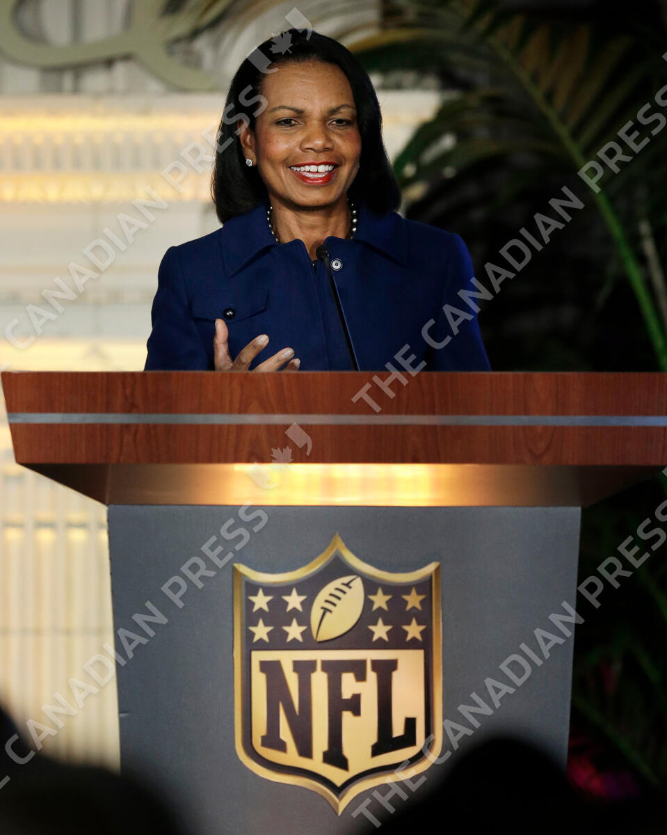 FILE - Former U.S. Secretary of State Condoleezza Rice gestures while speaking at the NFL Women's Summit, Thursday, Feb. 4, 2016, in San Francisco. Former U.S. Secretary of State Condoleezza Rice has been added to the new Broncos ownership group.