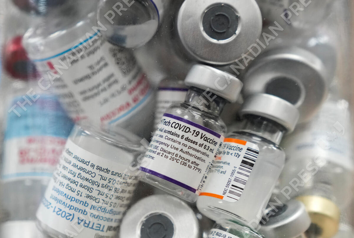 A jar full of empty COVID-19 vaccine vials is shown at the Junction Chemist pharmacy during the COVID-19 pandemic in Toronto on April 6, 2022. Federal health officials are bracing Canadians for another round of COVID-19 vaccines expected to roll out in the fall, and are urging those behind on their boosters to catch up now. Canada's chief public health officer Theresa Tam says circulating Omicron subvariants BA.4 and BA.5 are even more transmissible and able to evade immunity than previous versions, making a rise in cases likely in coming weeks. THE CANADIAN PRESS/Nathan Denette