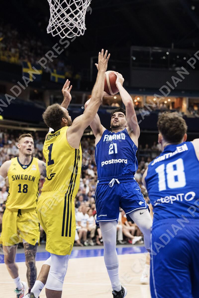 Edon Maxhuni (R) of Finland vies with Denzel Andersson of Sweden during the FIBA Basketball World Cup 2023 Group C qualifying match between Finland and Sweden in Espoo, Finland, on June 30, 2022. LEHTIKUVA / RONI REKOMAA - FINLAND OUT. NO THIRD PARTY SALES.