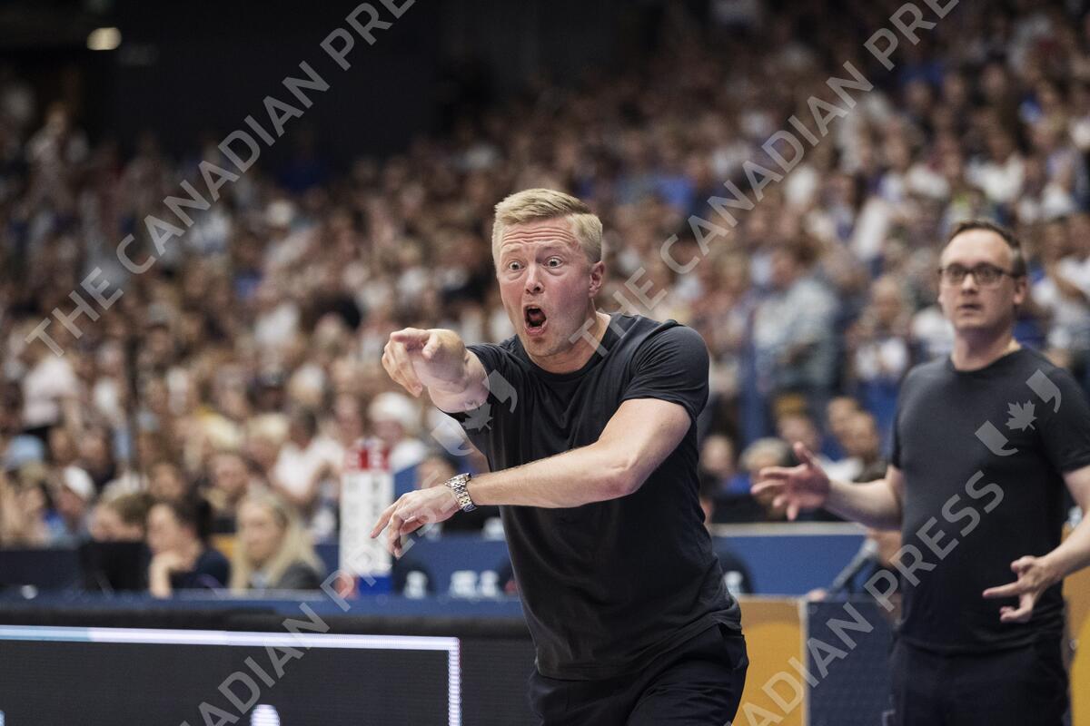 Head coach Lassi Tuovi of Finland reacts during the FIBA Basketball World Cup 2023 Group C qualifying match between Finland and Sweden in Espoo, Finland, on June 30, 2022. LEHTIKUVA / RONI REKOMAA - FINLAND OUT. NO THIRD PARTY SALES.