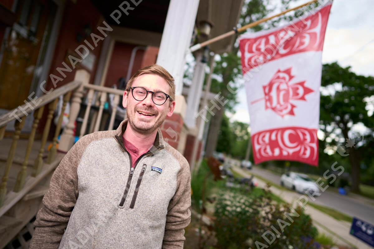 Blaine Chalk poses for a photo in front of his home in London, Ont., where he flies a version of the Canadian Flag designed by Indigenous artist Curtis Wilson, Monday, June 27, 2022. THE CANADIAN PRESS/Geoff Robins