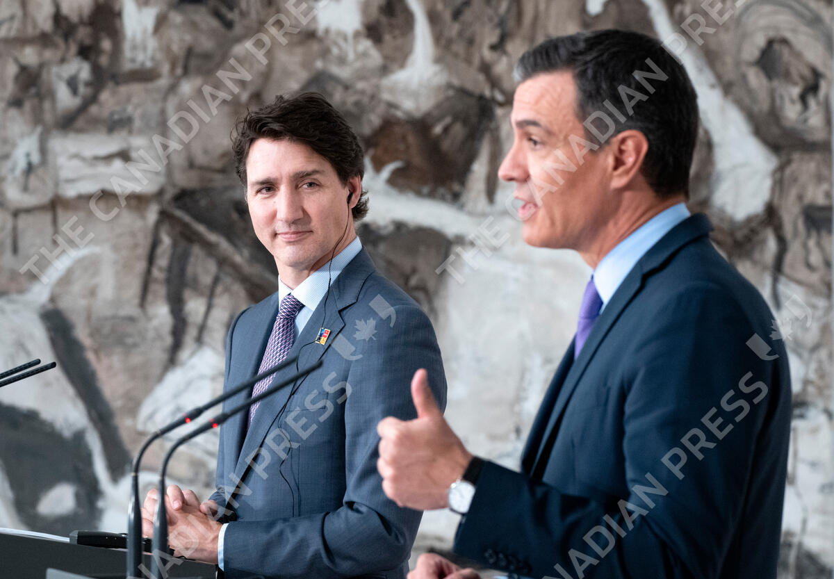 Prime Minister Justin Trudeau listens to Prime Minister of Spain Pedro Sánchez delivering a statement, in Madrid on Thursday, June 30, 2022. THE CANADIAN PRESS/Paul Chiasson