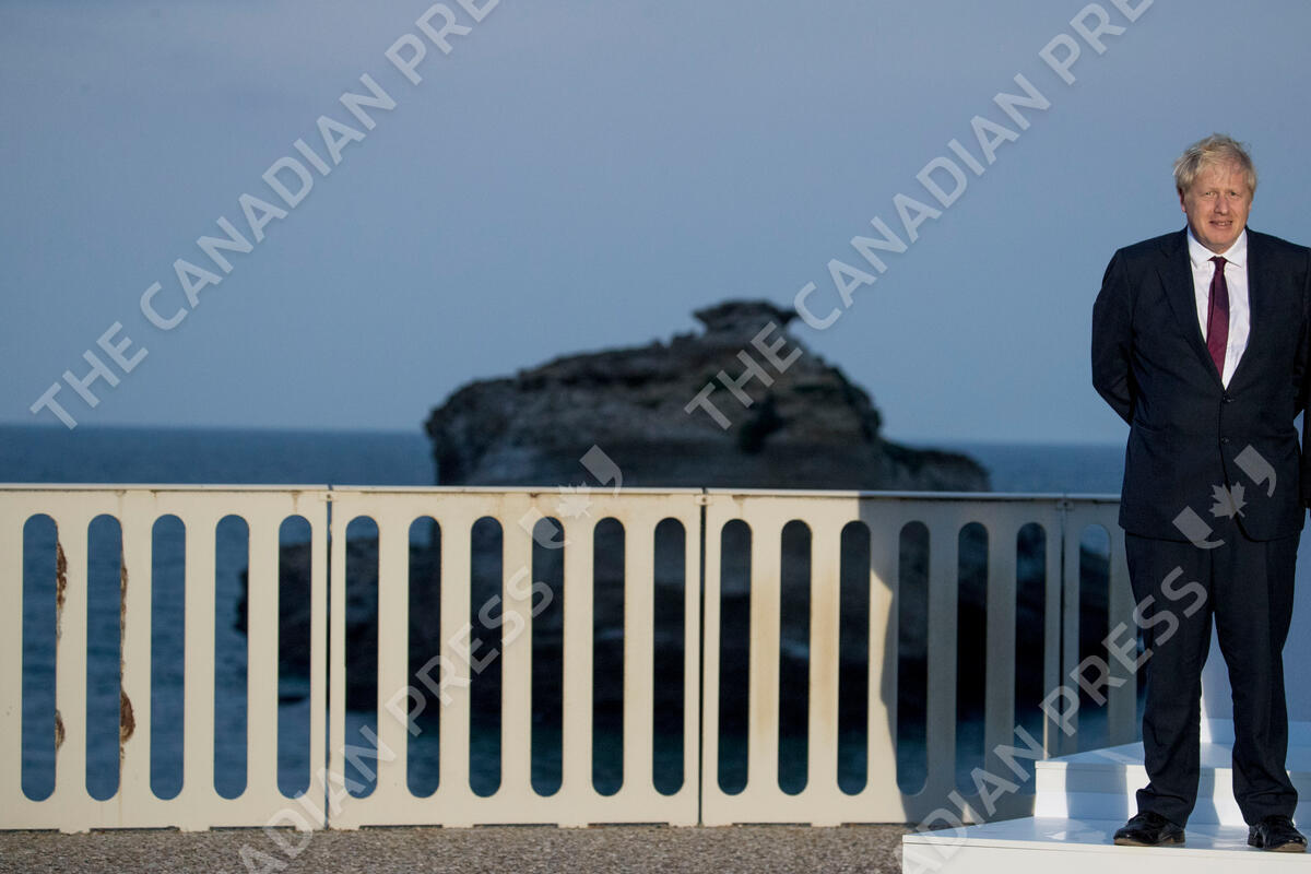 FILE - British Prime Minister Boris Johnson poses for the G-7 family photo at G-7 summit at the Hotel du Palais in Biarritz, France, Sunday, Aug. 25, 2019. British media say Prime Minister Boris Johnson has agreed to resign on Thursday, July 7 2022, ending an unprecedented political crisis over his future. (AP Photo/Andrew Harnik, File)