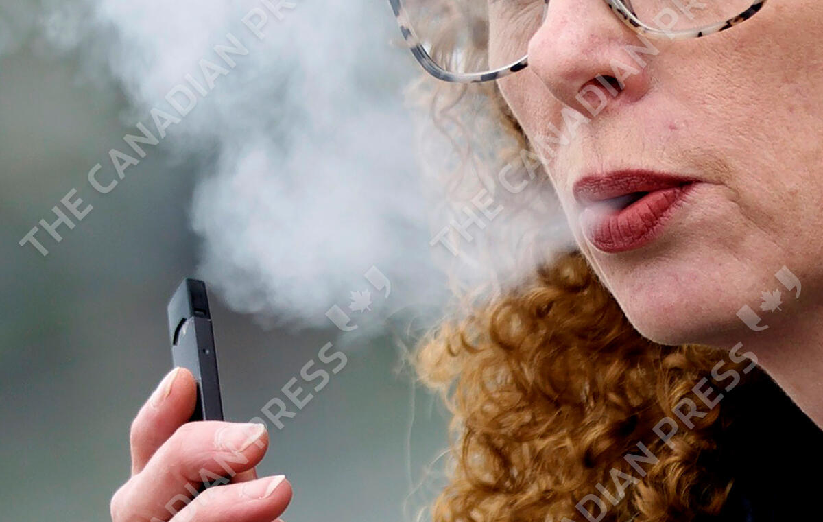 FILE — A woman exhales while vaping from a Juul pen e-cigarette in Vancouver, Wash., April 16, 2019. Juul has asked a federal court, Friday, June 24, 2022, to block a government order to stop selling its electronic cigarettes. Federal health officials on Thursday, June 23, ordered Juul to pull its electronic cigarettes from the U.S. market, the latest blow to the embattled company widely blamed for sparking a national surge in teen vaping. (AP Photo/Craig Mitchelldyer, File)