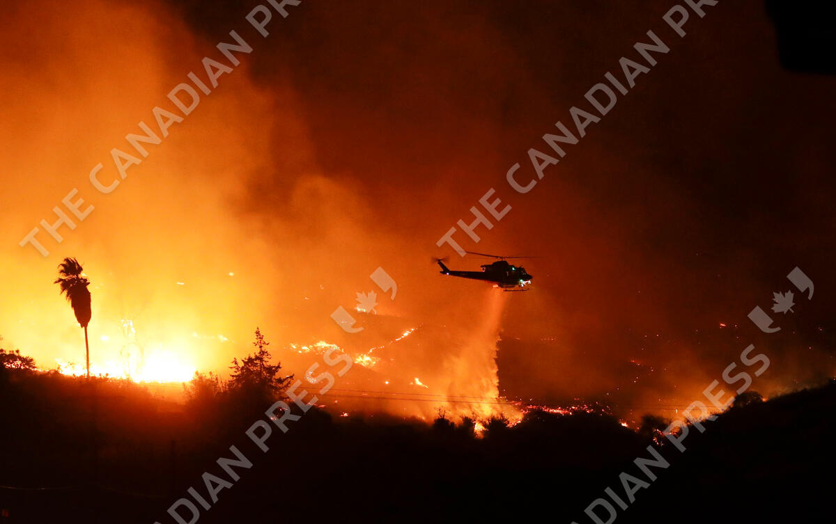 FILE - A helicopter drops water over a wildfire, Dec. 7, 2017, in Bonsall, Calif., that forced evacuations. Environmental groups have been arguing in California courts that developers are not fully considering the risks of wildfire and choked evacuation routes when they plan housing developments near fire-prone areas. (AP Photo/Gregory Bull, File)