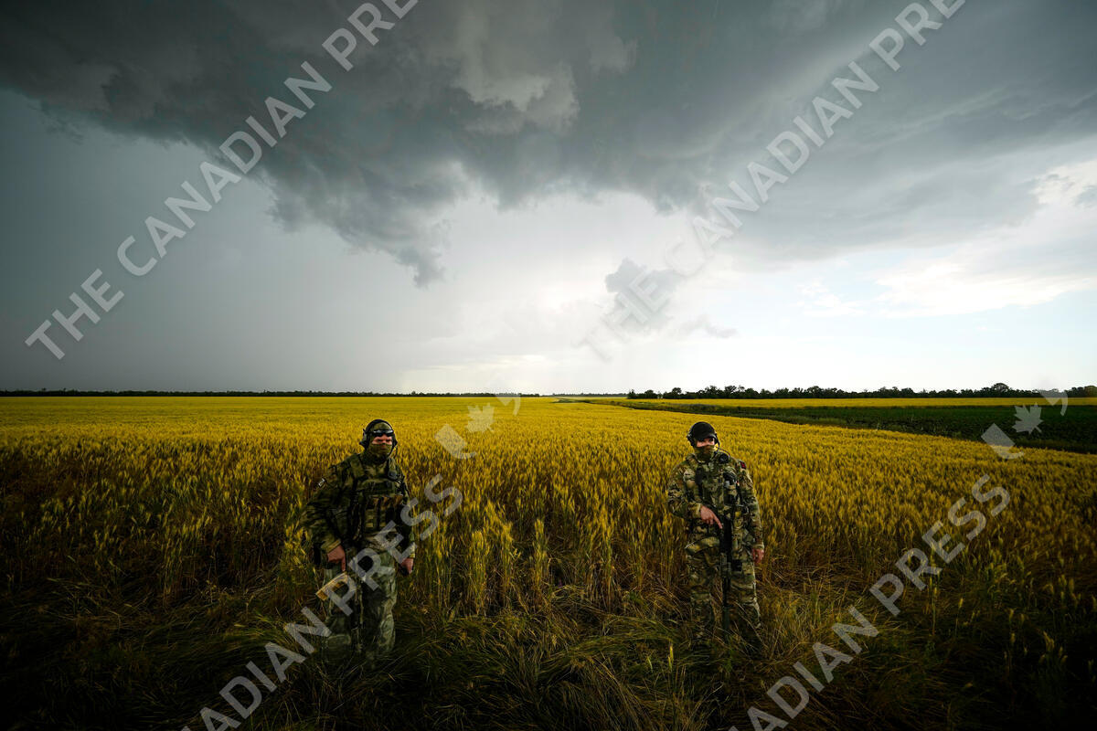 Russian soldiers guard an area next to a field of wheat as foreign journalists work in the Zaporizhzhia region in an area under Russian military control, southeastern Ukraine, Tuesday, June 14, 2022. The Zaporizhzhia region has been under control of the Russian forces since the early days of the Russian military action in Ukraine. This photo was taken during a trip organized by the Russian Ministry of Defense. (AP Photo)