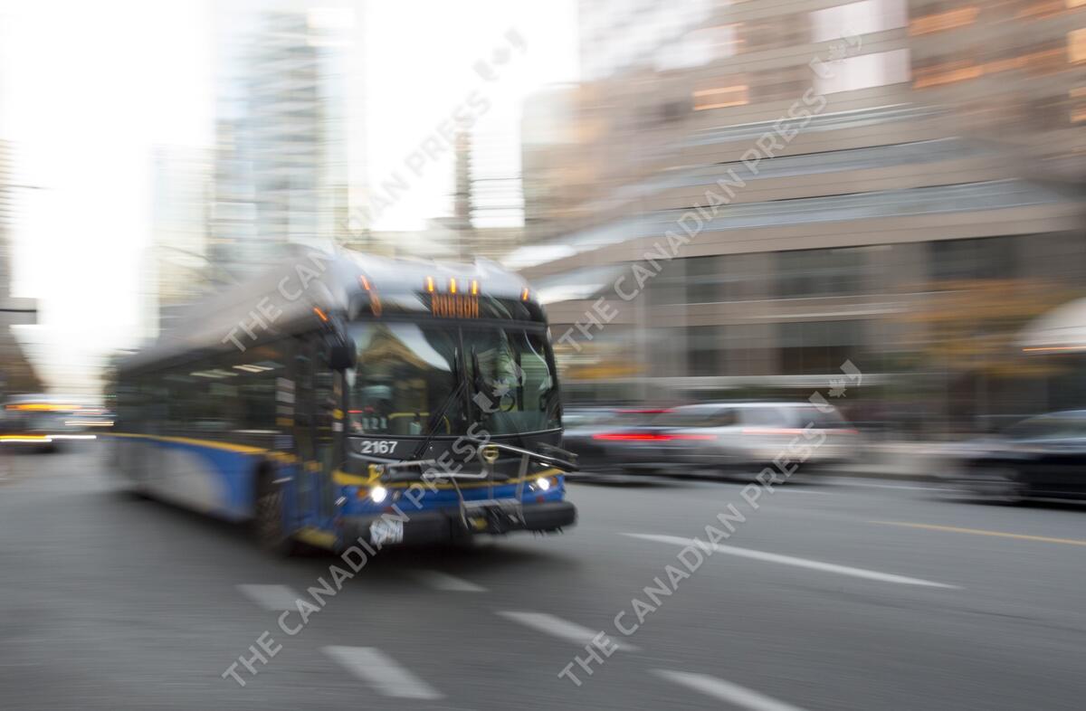 A potential strike by more than 180 transit supervisors seeking a new contract in British Columbia's Lower Mainland could have a major effect on commuters next week, with the bus drivers' union saying it would back such action. A bus is pictured in downtown Vancouver, Friday, November, 1, 2019. THE CANADIAN PRESS/Jonathan Hayward
