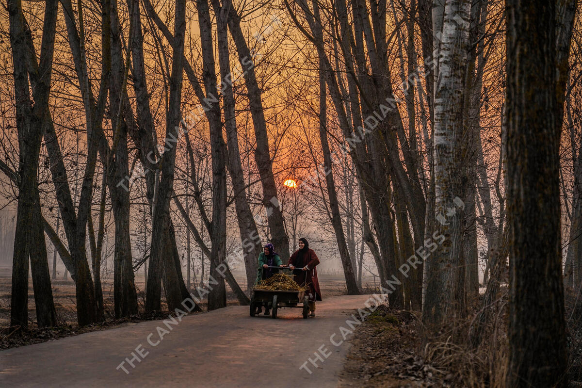 Kashmiri women push a handcart as the sun sets on a cold day on the outskirts of Srinagar, Indian controlled Kashmir, Sunday, Jan. 14, 2024. (AP Photo/Mukhtar Khan)