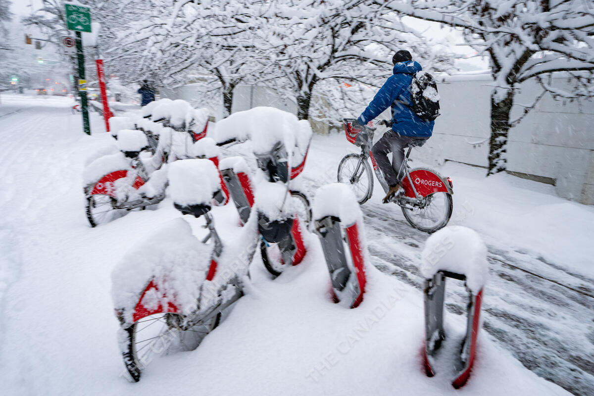 A person cycles past a snow covered bike stand during a snowstorm in Vancouver Wednesday, Jan. 17, 2024. THE CANADIAN PRESS/Ethan Cairns