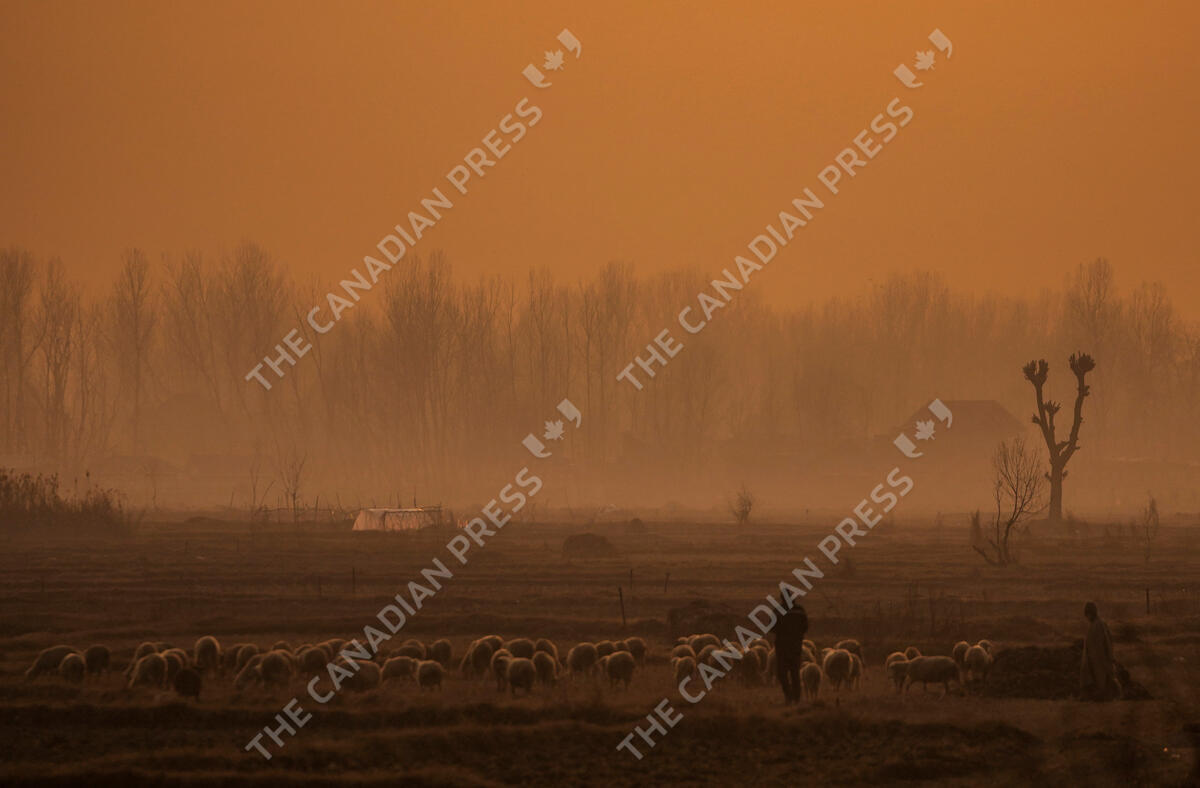 A man herd a flock of sheep as sunsets on a cold dry weather on the outskirts of Srinagar, Indian controlled Kashmir,Sunday, Jan. 14, 2024. (AP Photo/Mukhtar Khan)