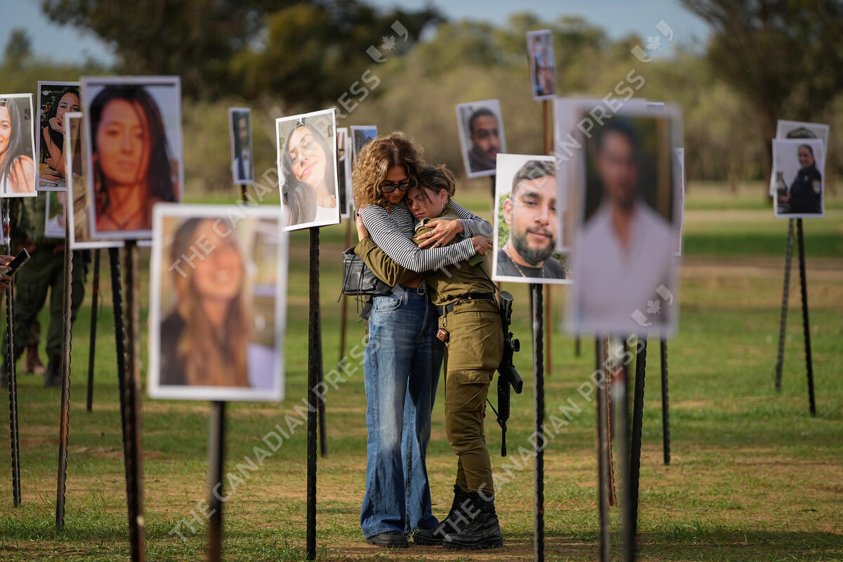 Israelis embrace next to photos of people killed and taken captive by Hamas militants during their violent rampage through the Nova music festival in southern Israel, which are displayed at the site of the event near kibbutz Re'im, Tuesday, Nov. 28, 2023. (AP Photo/Ohad Zwigenberg)