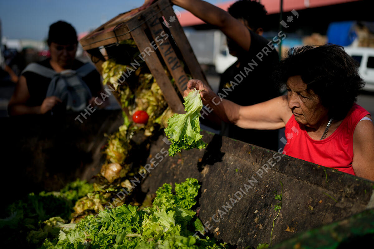 A woman culls through produce discarded by vendors at a market on the outskirts of Buenos Aires, Argentina, Wednesday, Jan. 10, 2024, as the annual inflation rate soared past 200%. President Javier Milei warned Argentines that his austerity measures aimed at staving off hyperinflation would initially have a "negative impact on the level of activity, employment, real wages, and the number of poor and indigent people." (AP Photo/Natacha Pisarenko)