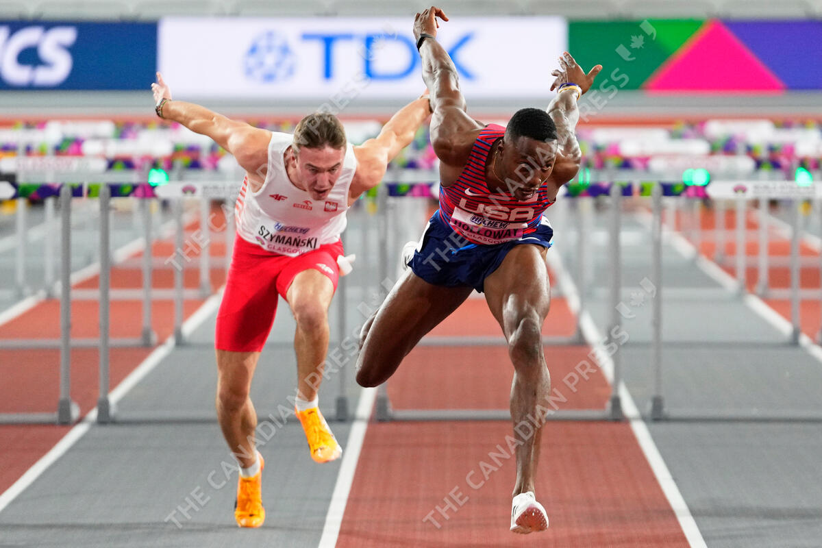 Grant Holloway, of the United States, crosses the finish line to win the gold medal in the men's 60 meters hurdles final during the World Athletics Indoor Championships at the Emirates Arena in Glasgow, Scotland, Saturday, March 2, 2024. (AP Photo/Petr David Josek)