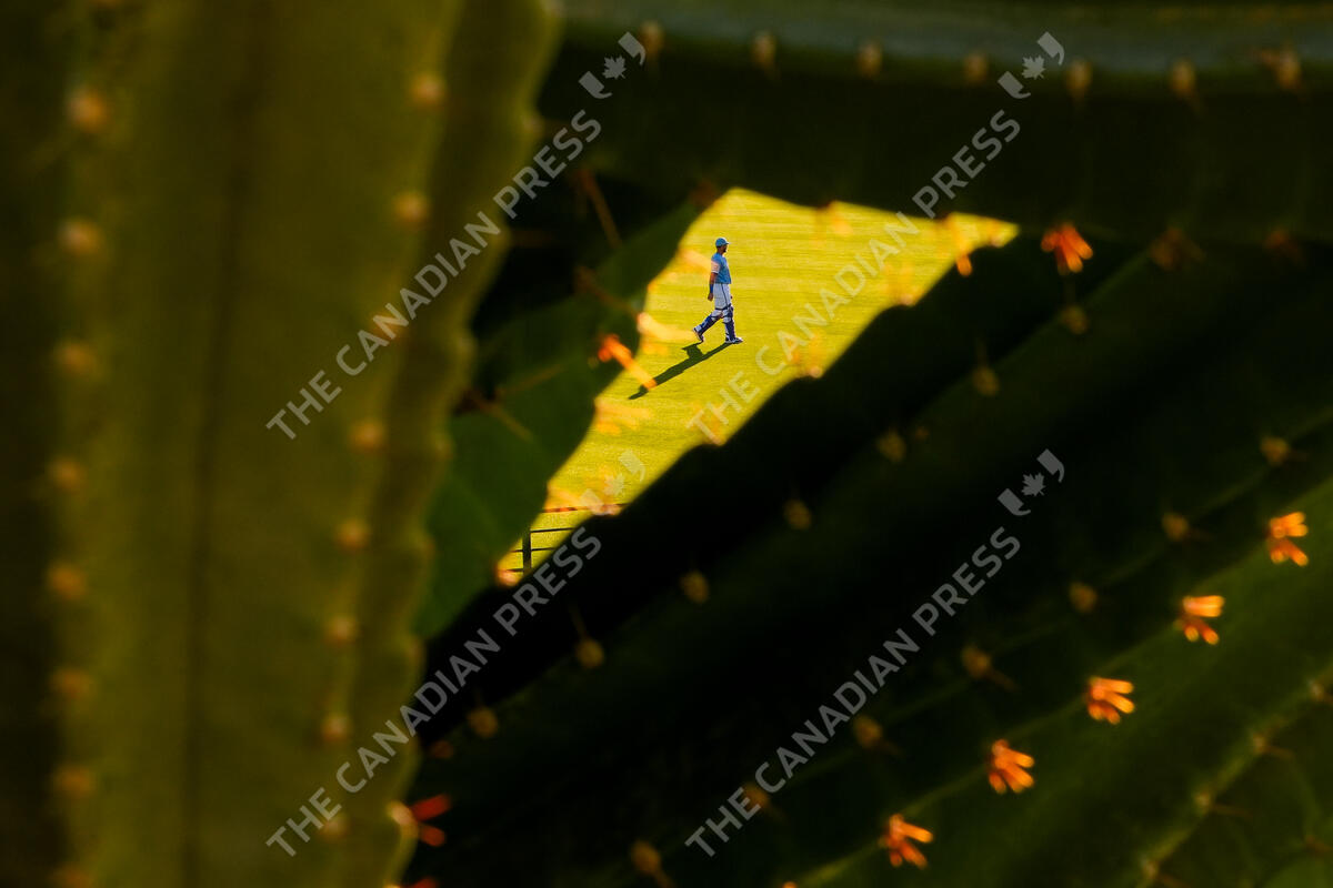 Kansas City Royals catcher Austin Nola walks in the outfield before a spring training baseball game against the Chicago Cubs, Tuesday, March 5, 2024, in Surprise, Ariz. (AP Photo/Lindsey Wasson)