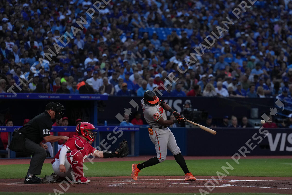 Baltimore Orioles shortstop Jorge Mateo (3) hits a single in front of Toronto Blue Jays catcher Alejandro Kirk (30) during second inning American League MLB baseball action in Toronto on Monday, July 31, 2023. THE CANADIAN PRESS/Nathan Denette